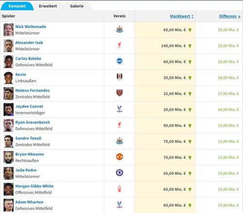 雷速体育10月17报道 此前,德国转会市场进行了新一期英超球员身价的更新。纽卡前锋沃尔特马德的身价上涨至6500万欧,上涨了3500万欧,是身价上涨幅度最大的球员,利物浦前锋伊萨克和布莱顿中场巴莱巴均上涨了2000万欧。