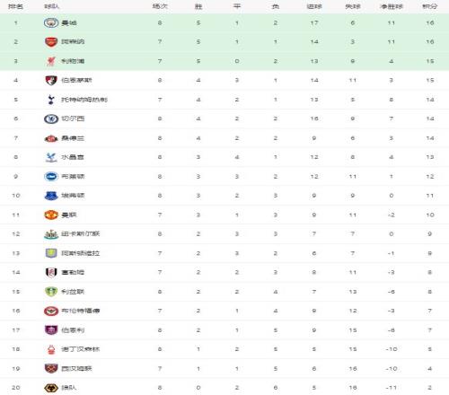 随着曼城20埃弗顿,切尔西30,英超最新积分榜:阿森纳让出榜首
