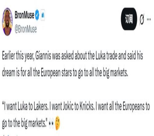 另外,字母哥在东契奇被交易到湖人时的言论被扒出,当时他说道:“我希望东契奇能去湖人,希望约基奇能去尼克斯,我希望所有欧洲球员都能加盟大球市球队。”如今回顾这段言论,这或许也暗示着自己想去大市场球队。